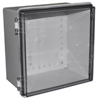 IP67 enclosure ABS with a clear lid featuring a hinged lid with latches. Large X8 enclosure provide the perfect solution to high up pole/surface mount enclosure systems due to high ingress protection and dual door accessory. 300x300x180